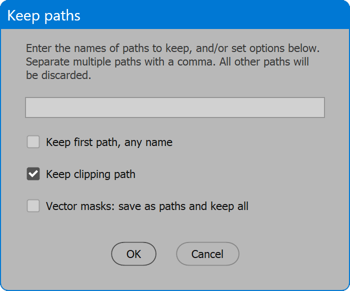 Keep all paths, Discard all paths, Keep paths... — Keep all paths leaves all paths untouched. Discard all paths removes all paths including any set to clipping path. Keep paths... displays an additional dialog with further options: